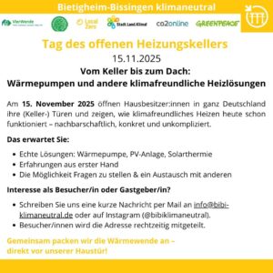Wir von BiBi-klimaneutral laden Sie zu diesem Anlass in Bietigheim-Bissingen ein sich hautnah über klimaneutrale Heiztechnik zu informieren, Erfahrungsberichte von anderen Menschen zu hören und sich das ganze direkt vor Ort im Heizungskeller anzusschauen.